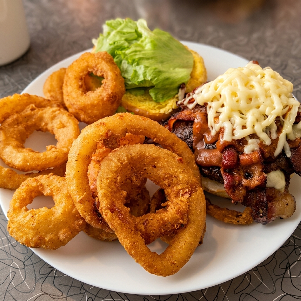 A flat-top smash-style burger with crispy bacon and melted cheese, served on a fresh bun with all the fixings. A classic diner favourite at White Star Diner.